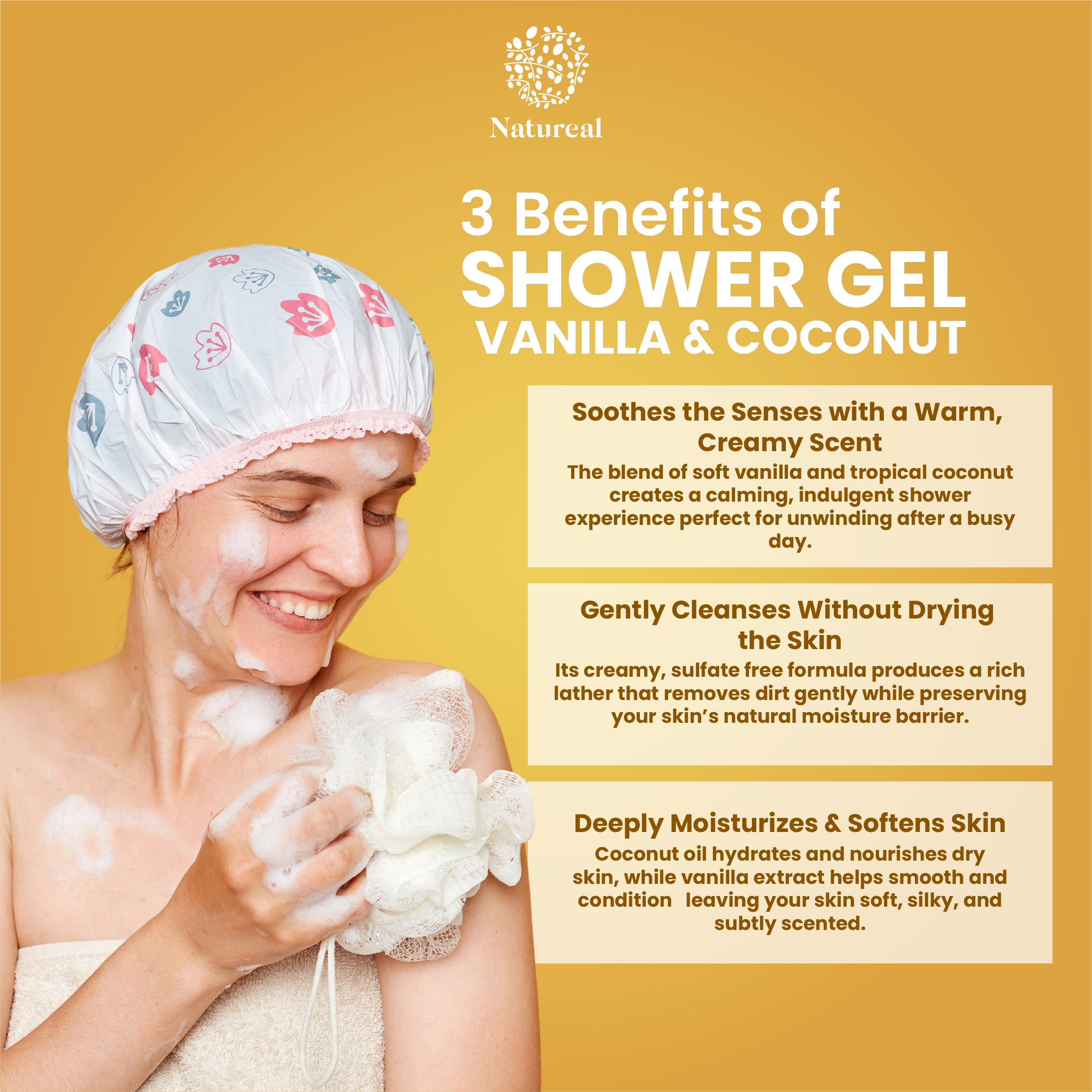 • Aromatherapy Bliss: The warm, indulgent scent of vanilla and coconut essential oils relaxes your senses, creating a tropical escape during every shower.